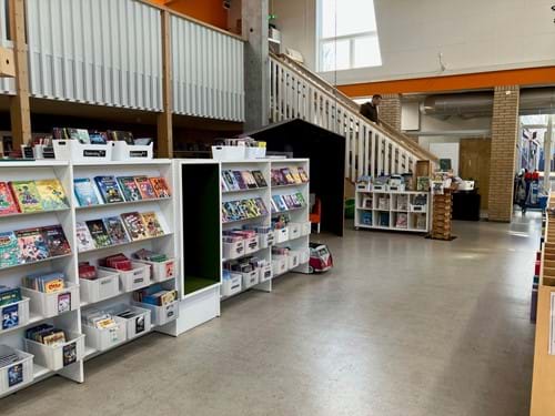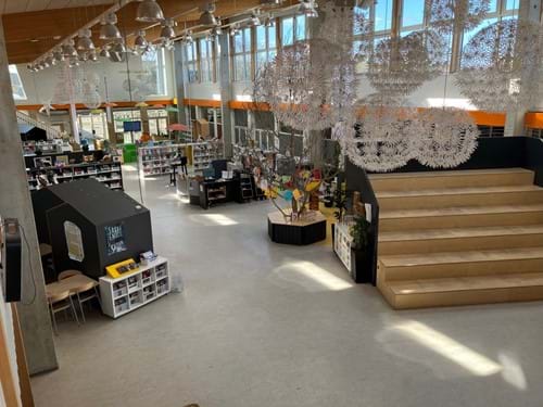 I området D flyttes halvdelen af biblioteket til område E og F. Stort siddemøbel flyttes til område E og F